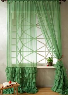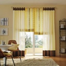 - Rural curtains suitable for bringing home comfort even in city apartments. Such curtains have a simple design, straight cut. Usually their length is small, sometimes the structures are mounted on a special cord, stretched in the middle of the window. This option gives the room a special charm.