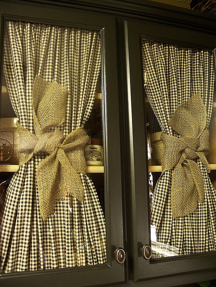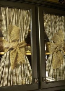 - Another detail of the atmosphere of a cozy country house - hourglass curtains. They are hung on small windows and even on doorways and doors of small cabinets. Such curtains are a narrow canvas, equipped with geometric patterns.In the middle part it is tied with decorative ribbons, knots or bows. Often designs are decorated with additional elements.