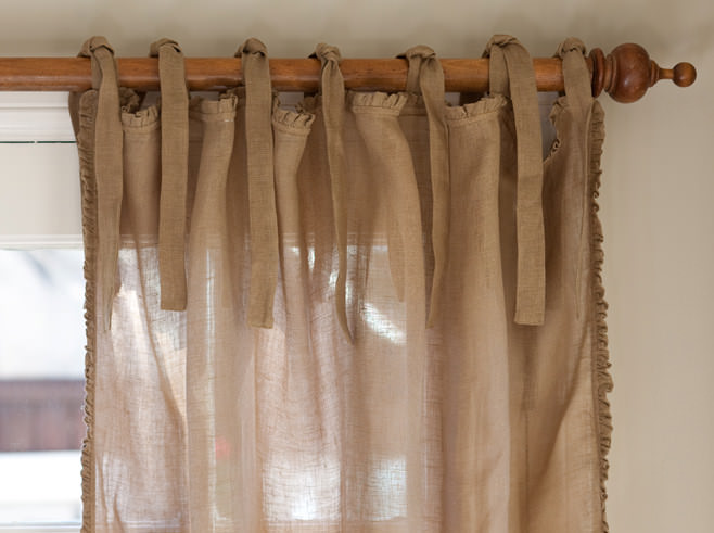 - Linen is a durable material that perfectly protects from sunlight. It is used for the manufacture of curtains and ordinary curtains. Eco-style fans often like to hang single-layer curtains of flax so that the texture of the material is visible in the light. The fabric is quite capricious for washing and can be reduced in size, so it is recommended to process it with steam and leave a certain length in stock.