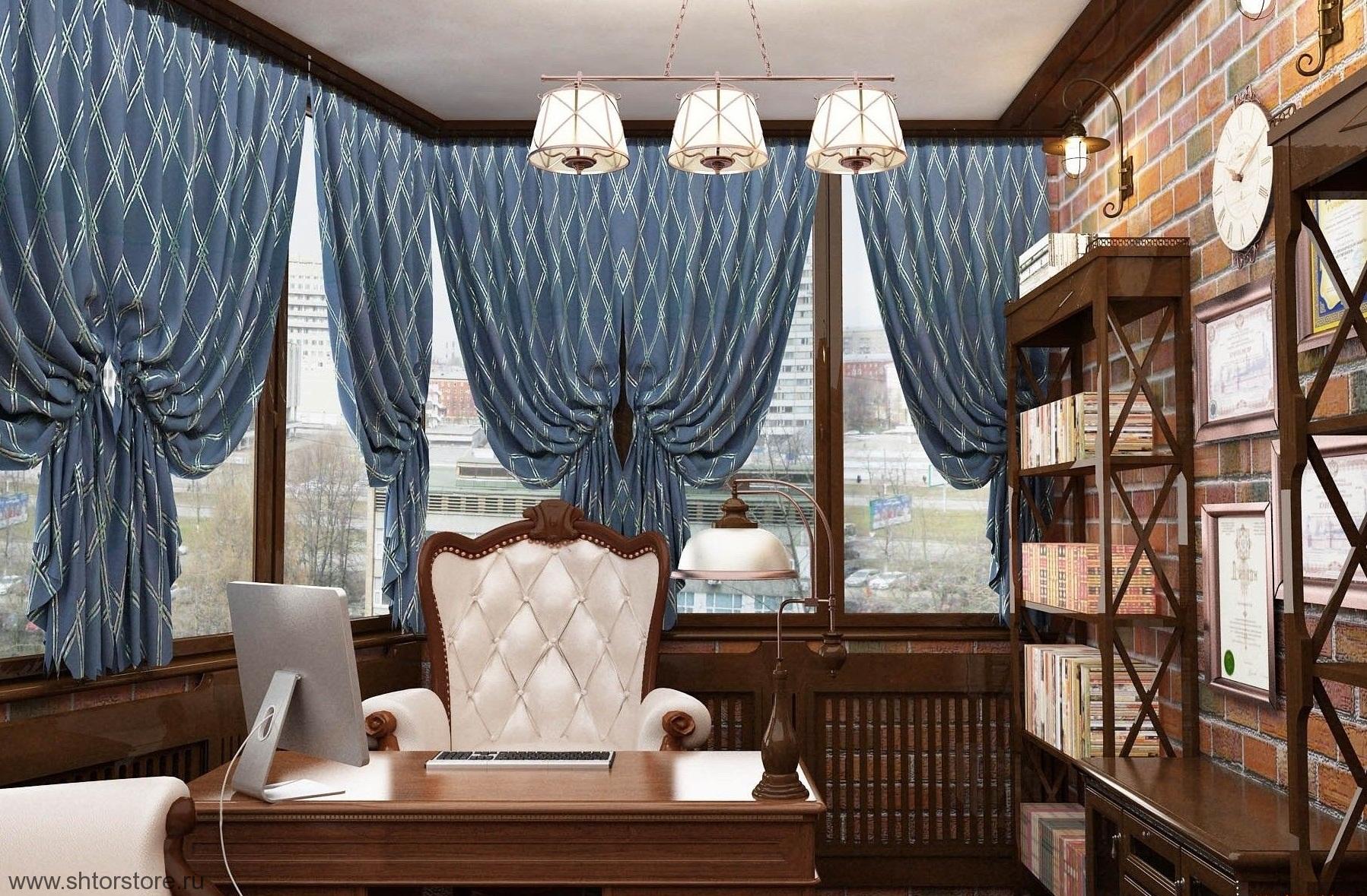 - For cabinet A universal option can be blinds. Depending on the restraint of the overall situation, it can be fabric or plastic structures. Sometimes they pick up wooden blinds, which are designed in the tone of office furniture. Width of products is determined by the size of the window. Models with large plates will look ridiculous on a miniature window opening.