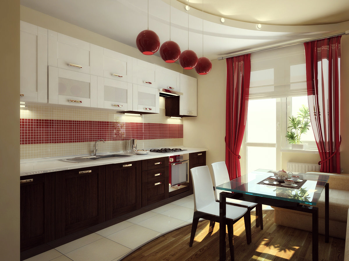 - Kitchen -Another good spot for country models with simple prints. To bring an unusual atmosphere, you can provide the kitchen with curtains in the style of a cafe.This design in the style of a diner perfectly fits into the room where the kitchen area is combined with the eating area.