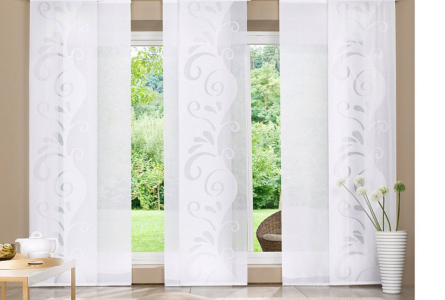 - Curtains presented in the form of fabric strips, are called sliding. Thick fabric is often used in combination with tulle. Their peculiarity is an easy way to hang on the eaves with the help of clothespins and the ability to move apart in a horizontal direction.