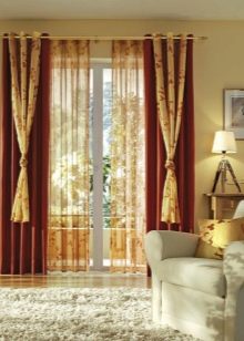 To decorate the hall, traditionally, thick curtain fabric is used in combination with light curtains. Material curtains and curtains should be of two colors, not necessarily contrasting. For light curtains fit shiny organza or veil with embroidery.
