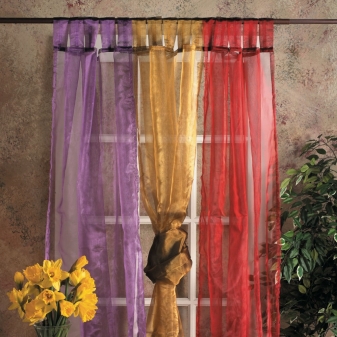 - Organza. Hard and spiny material is often chosen as curtains. Organza is matte and shiny. Both are draped easily, creating interesting large folds. Organza curtains are light enough, but do not fly away at the slightest breeze of the wind. To take care of them, it is enough to wash them in a typewriter, not wringing, and immediately hang on the eaves - the fabric dries very quickly.