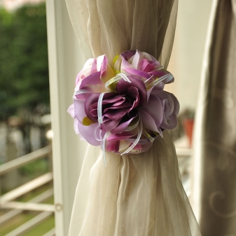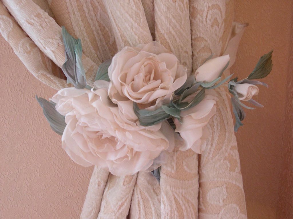 - Holders look very attractive from fabric. These decorative elements look very beautiful and diverse, they are flowers, tassels, bows, ribbons. They are used for roller blinds, as well as for classic models. The composition of flowers looks very bright, which is a contrast to the curtain canvas.