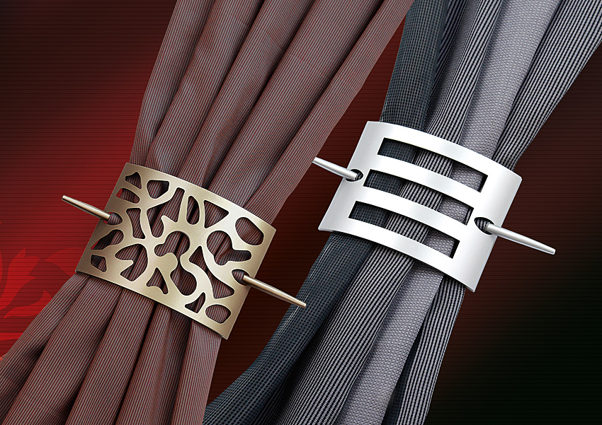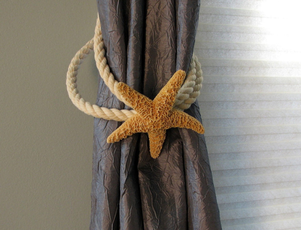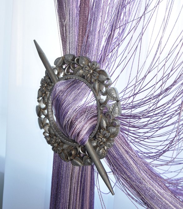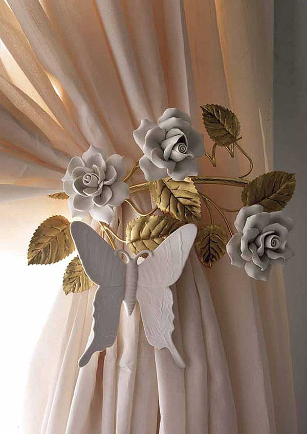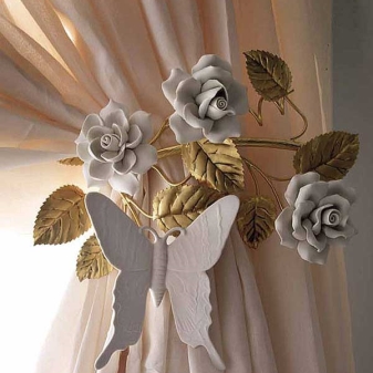 Such design elements of curtains, like clips, look very original when they perform an additional aesthetic load. For example, in the decoration you can use elements of flora and fauna.