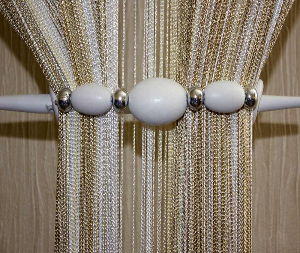 An interesting and original solution can be combined with curtains in the form of threads. They do not move on the eaves. In order to open the window, you just need to grab half of the curtain-threads with clips or decorative loops. They can be intercepted by various clips in the form of flowers, tying knots from cords with fringe, hanging ornaments, beads, and tinsel. Every day you can make a novelty in the interior.