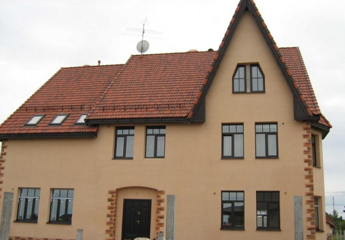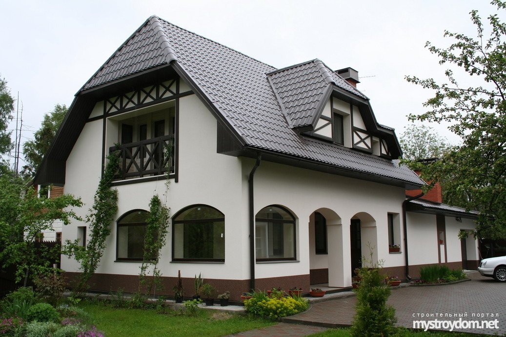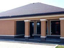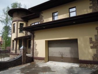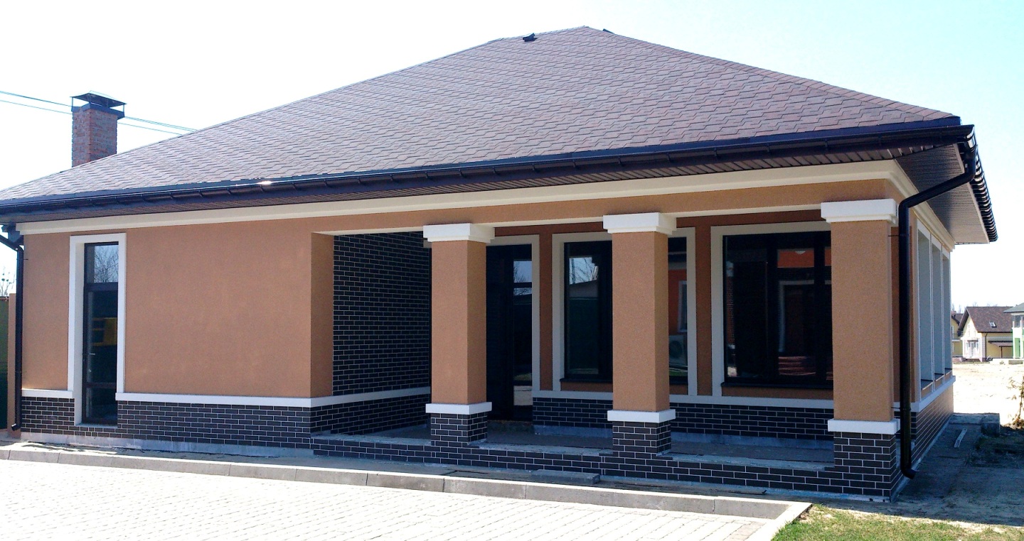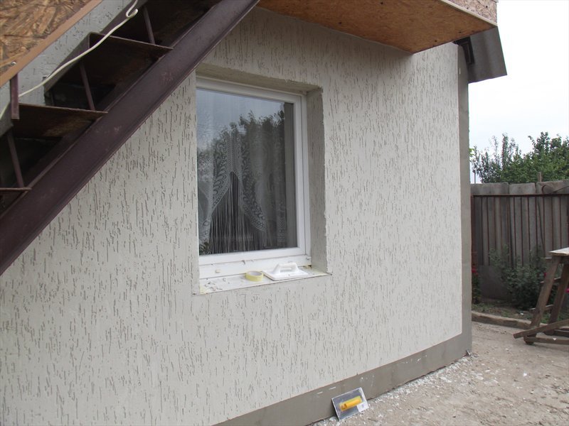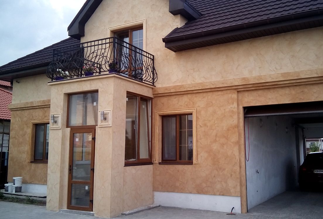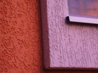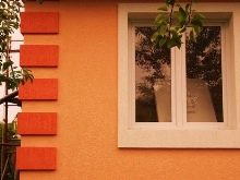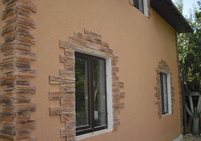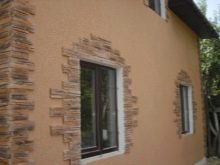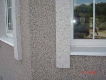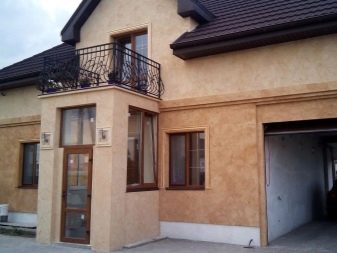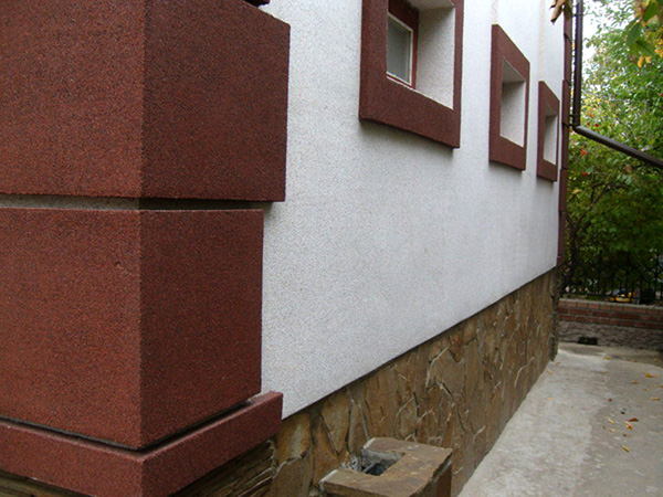 - When finishing the main surface with material with large-sized grains, the protruding elements of the facade can be coated with plaster particles of a small fraction. This combination looks very harmonious.