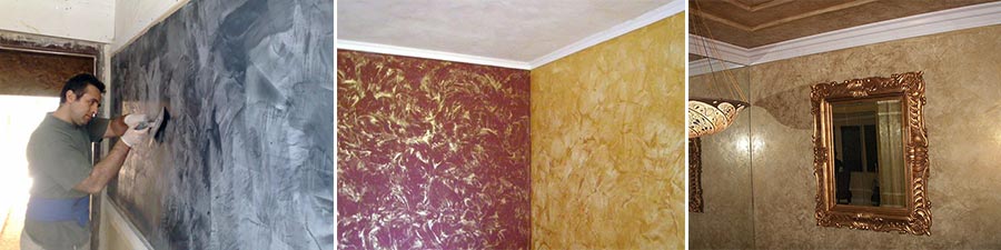 To make a 100% quality coating, the base (starting) material is tried to be tinted to the base tone, which is chosen for the design. This will prevent the base of the wall or ceiling being translucent. Unlike other varieties for Venetian plaster bred 2 or even 3 batches of the same color of varying degrees of intensity. Light, transitional and dark color are obtained.