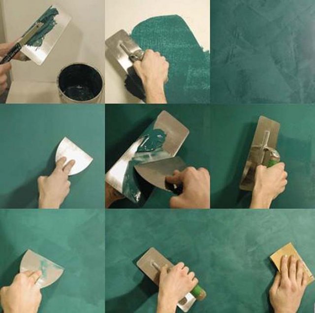 They are applied on the base of the trowel in small portions, alternating between themselves or in a chaotic manner. Thus it is necessary to smooth them among themselves. This should be done quickly. You can use a special trowel for Venetian plaster. To obtain a gloss effect, light polishing is necessary. At this stage, finishing work is useful varnish or wax.