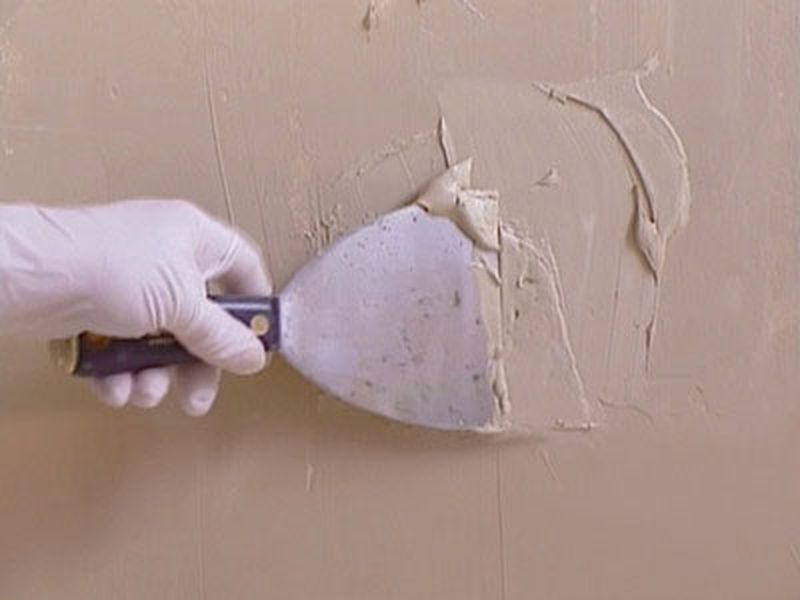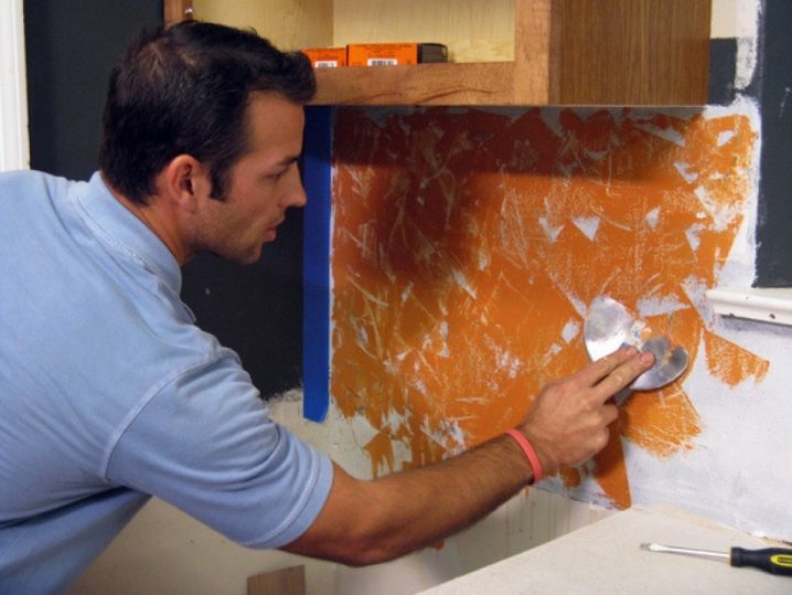 - Removing the old cover. Remove old paint, remove paint. If you remove the wallpaper, it is necessary to pre-soak them with water using a spray gun. This will minimize the amount of dust and allow you to remove old panels in large fragments. In the presence of grease stains they do not mask, and scraped from the surface. The same is done in case of detection of significant contamination.
