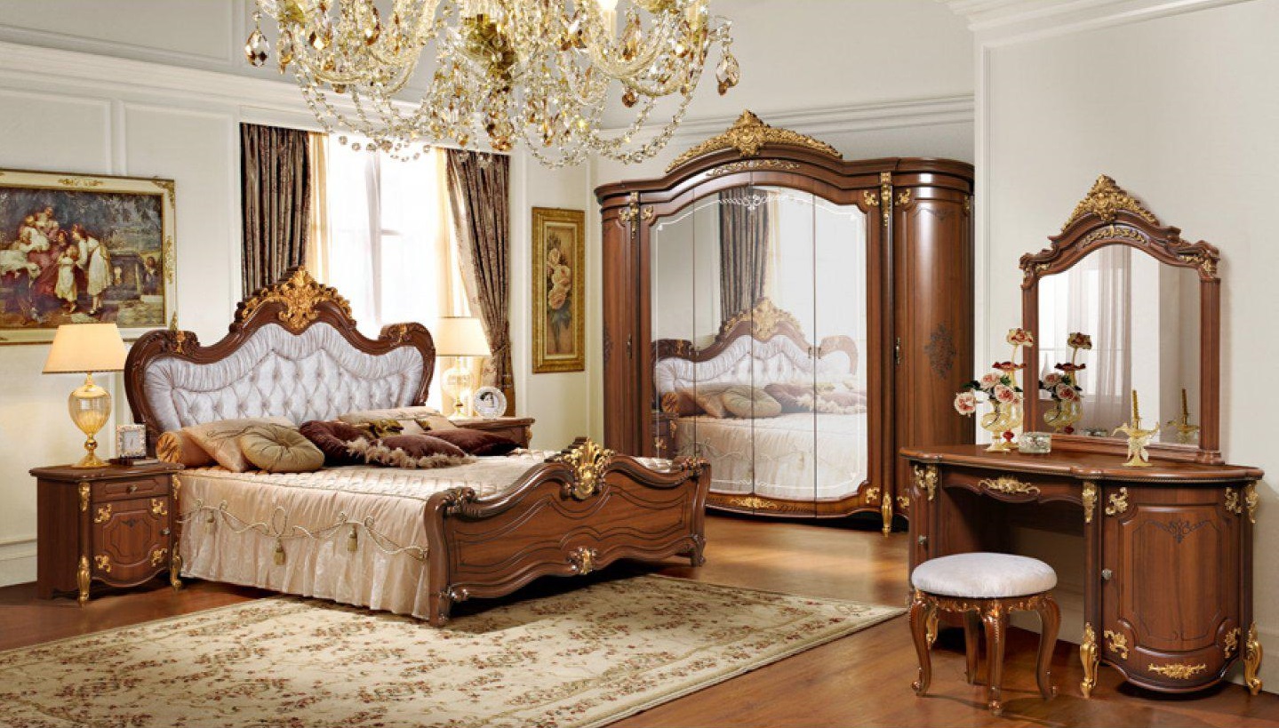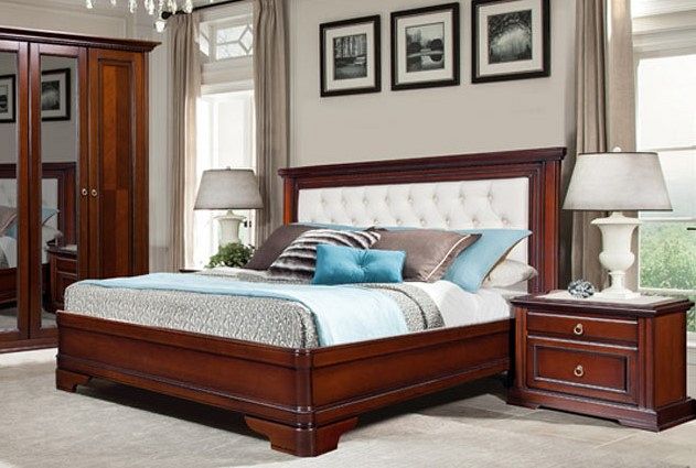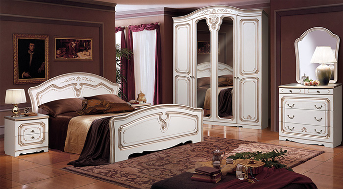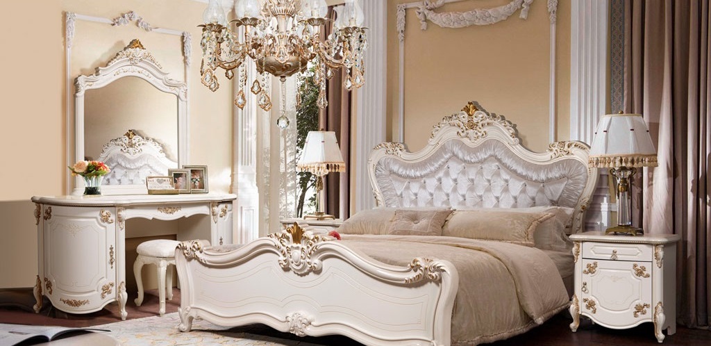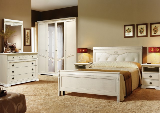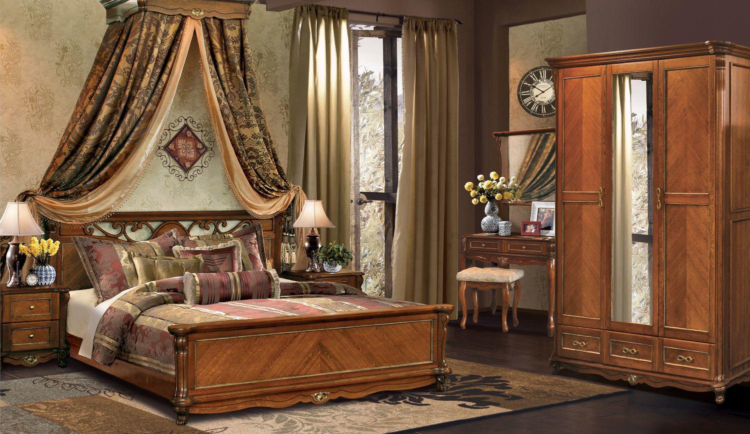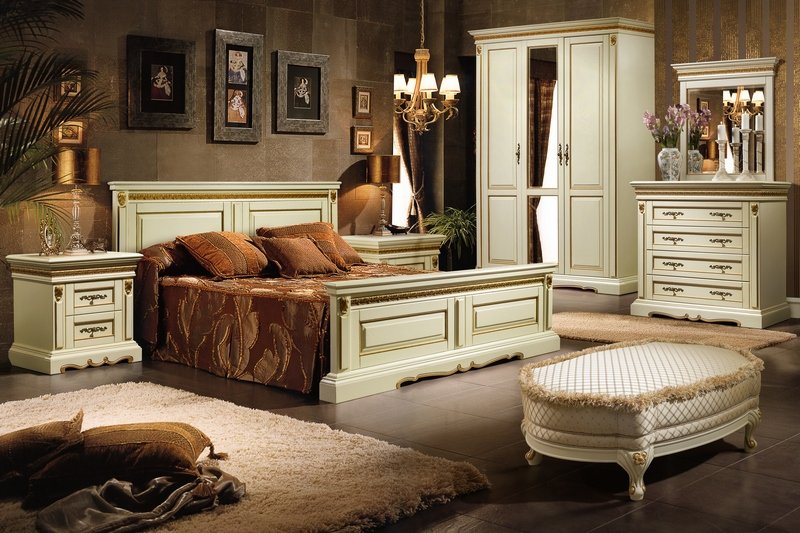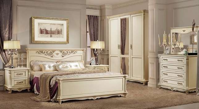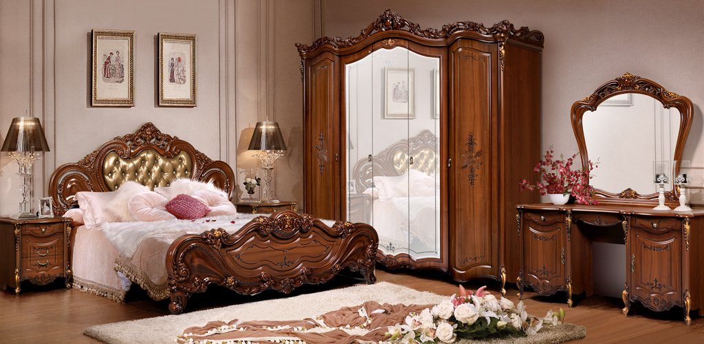 A bedroom in this style usually consists of a high and roomy bed, two carved nightstands and a large closet and a dresser with or without a mirror.