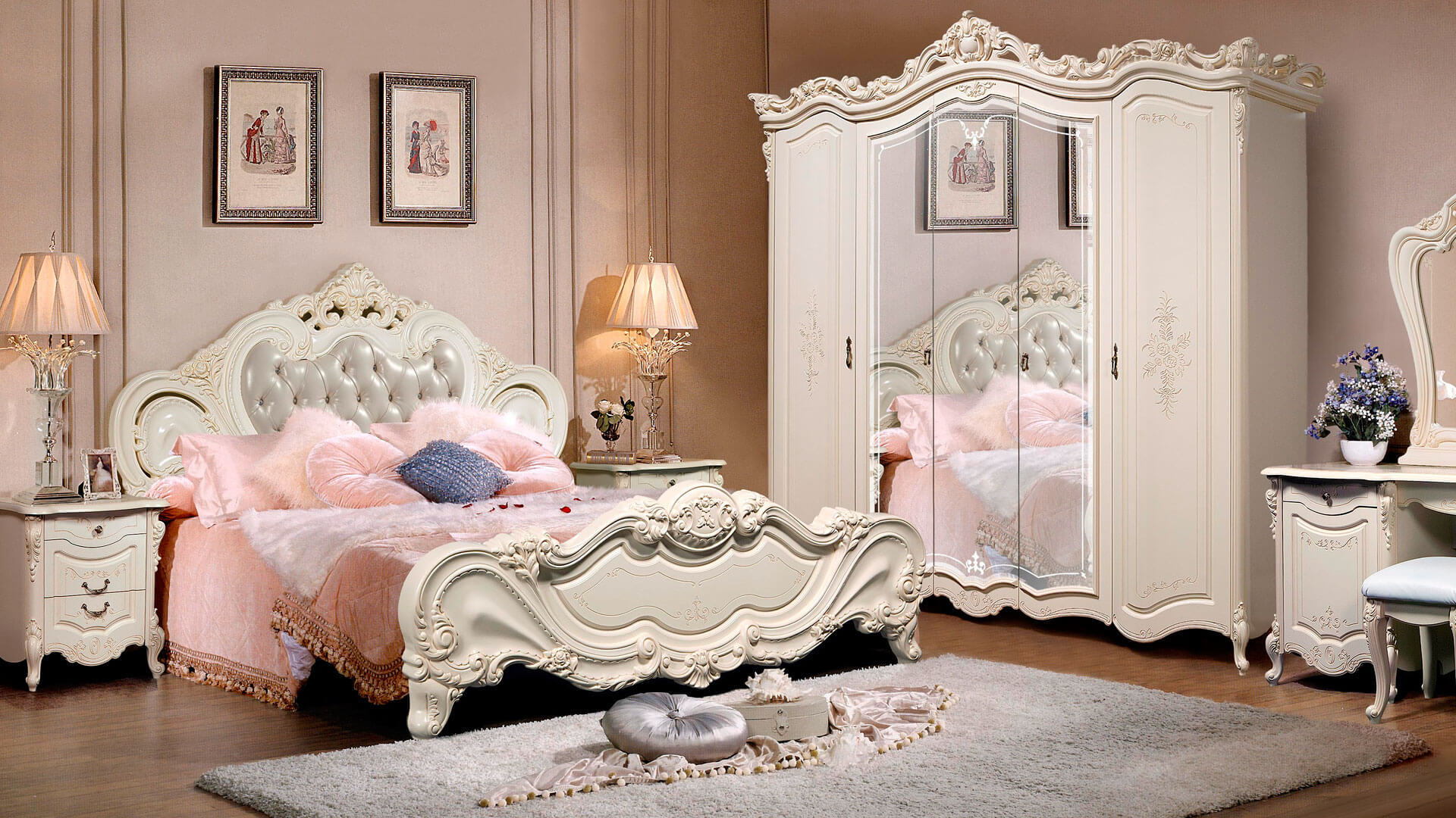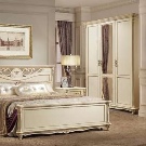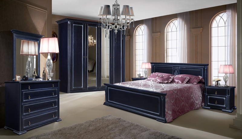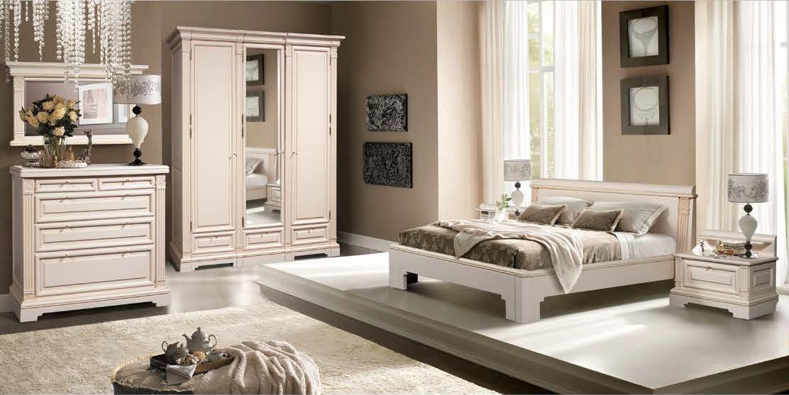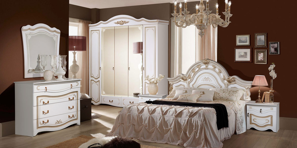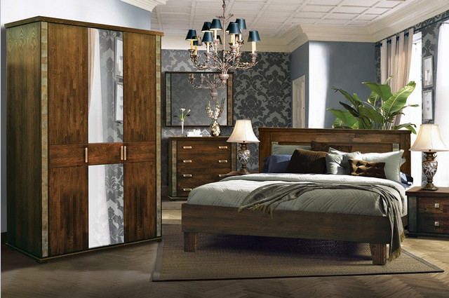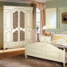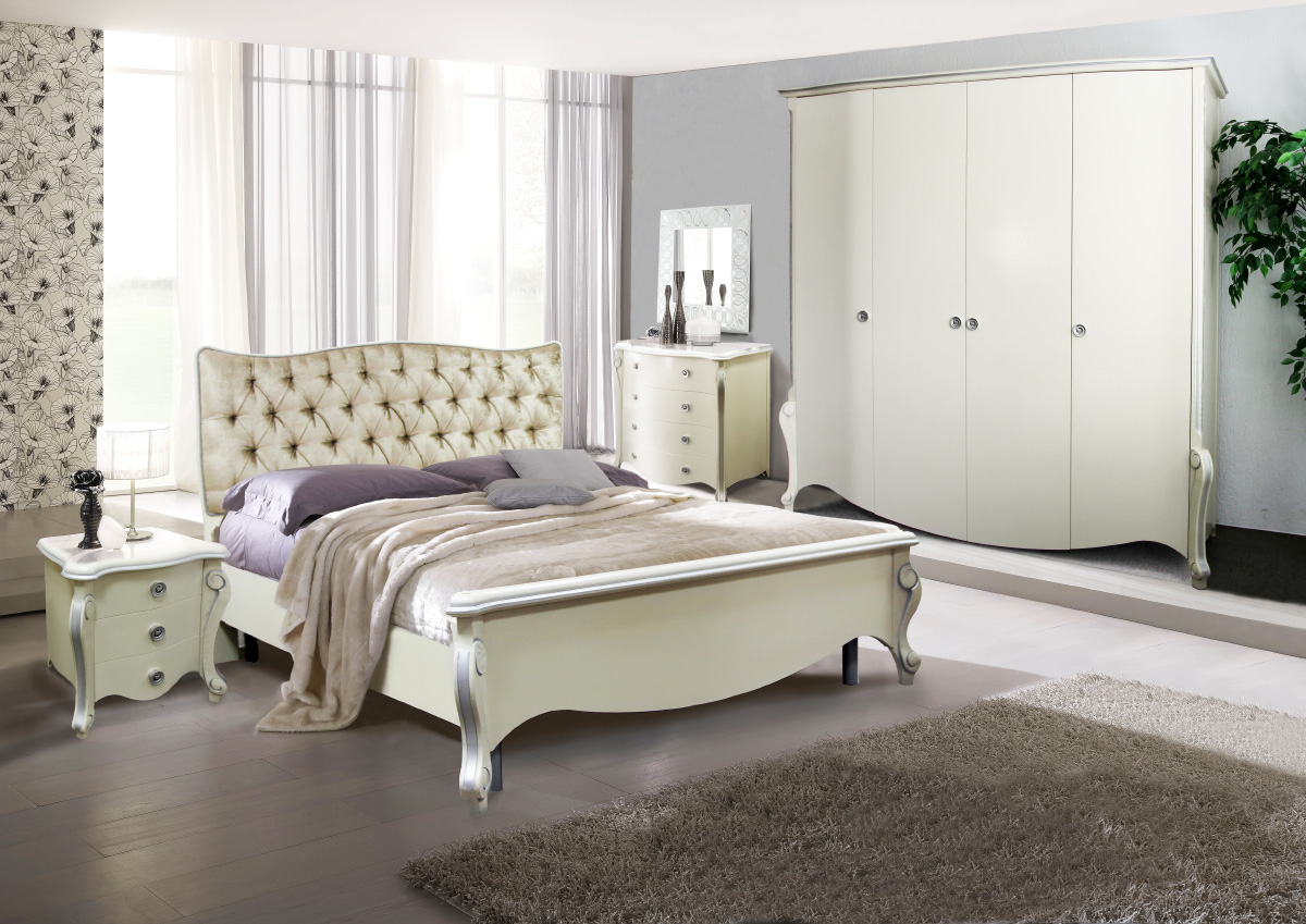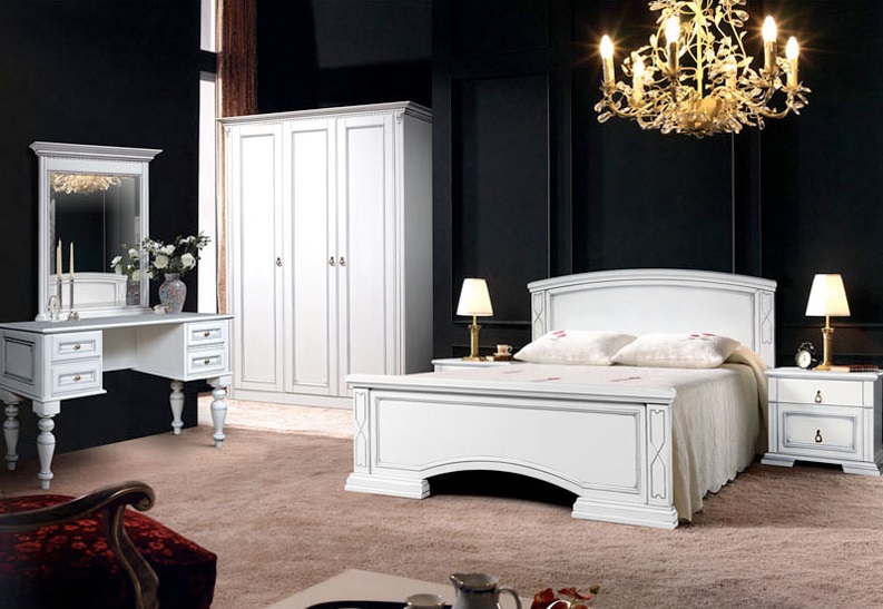 A bedroom in this style usually consists of a high and roomy bed, two carved nightstands and a large closet and a dresser with or without a mirror.