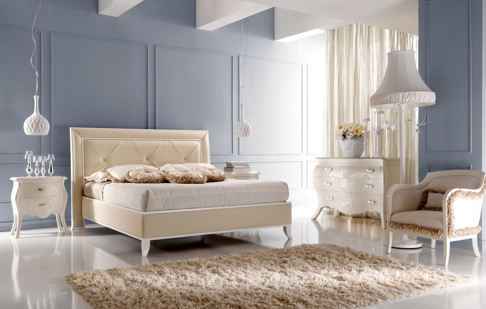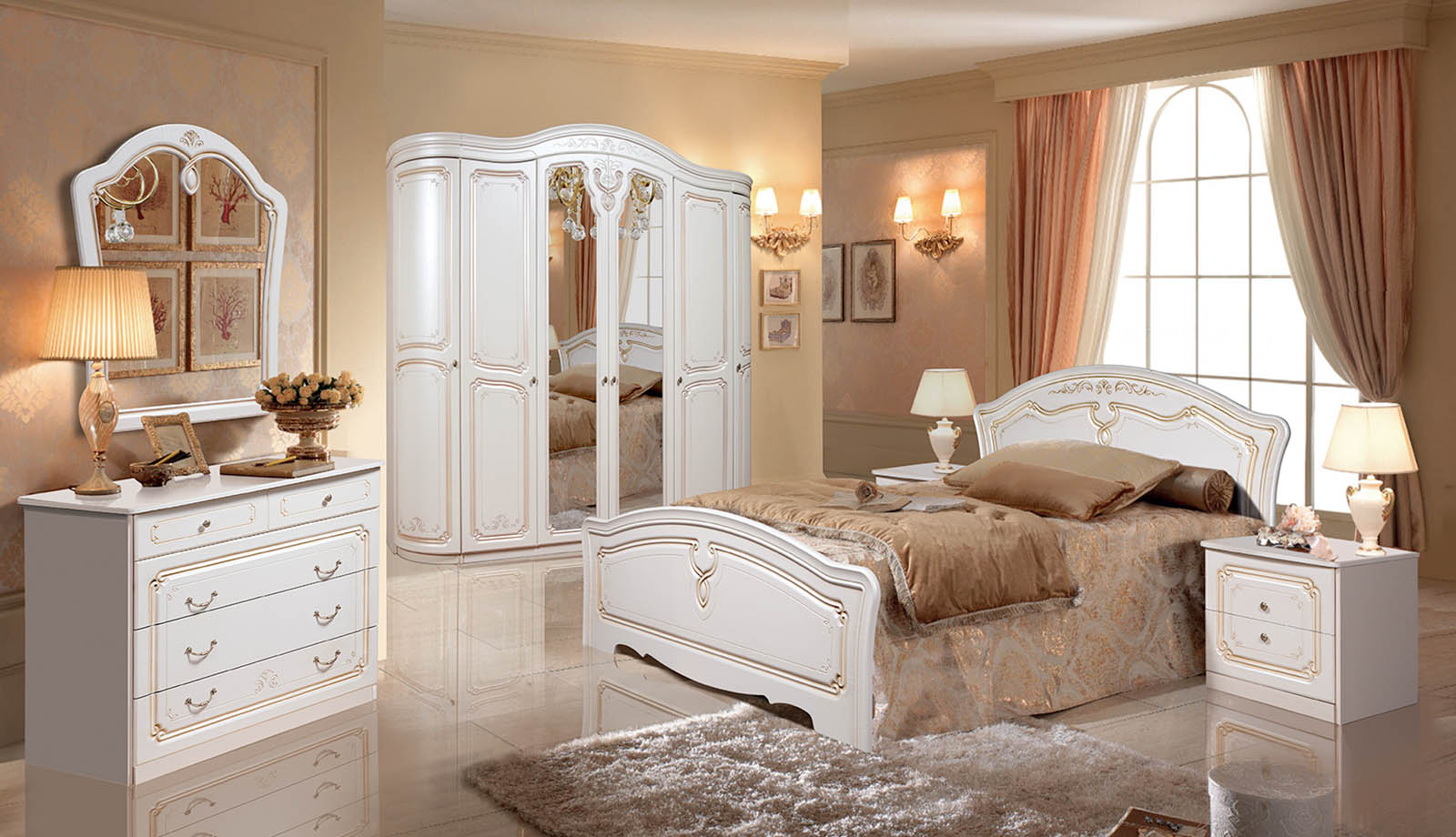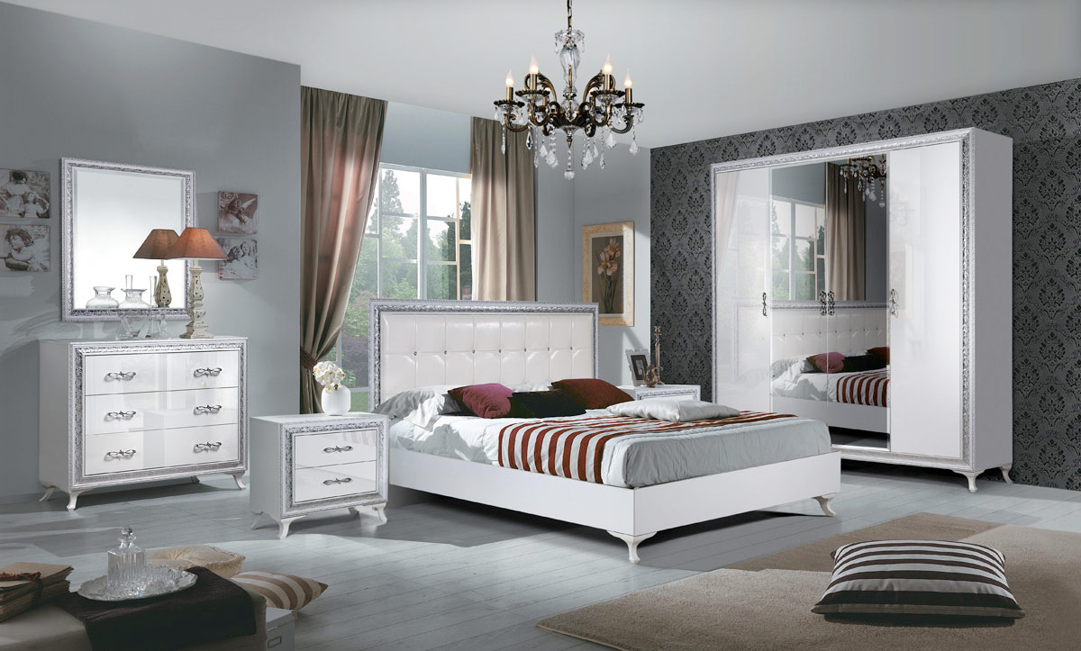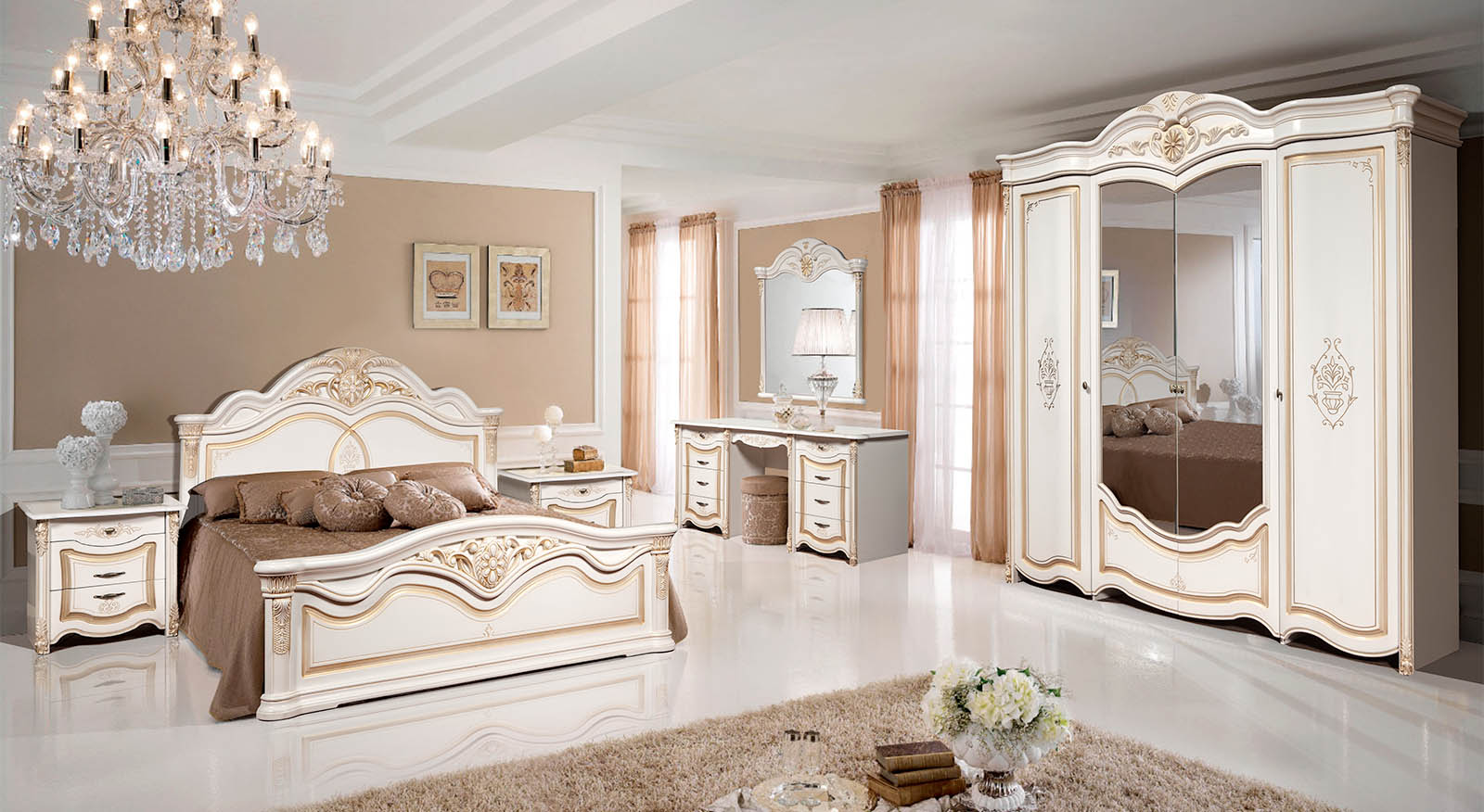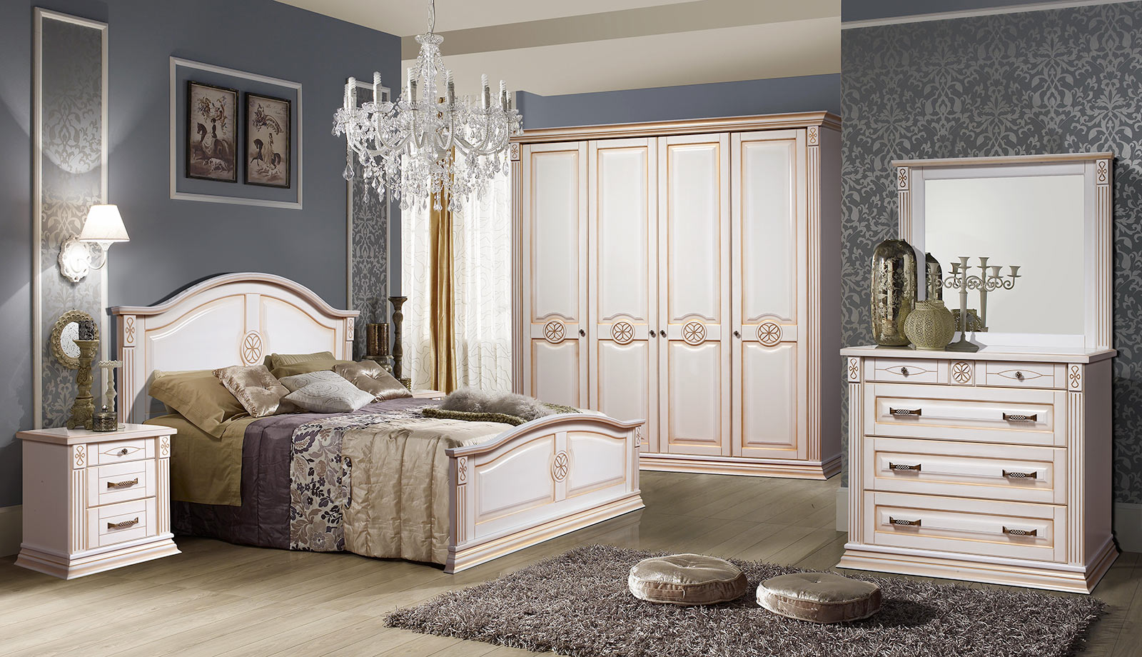A bedroom in this style usually consists of a high and roomy bed, two carved nightstands and a large closet and a dresser with or without a mirror.