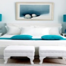 Turquoise effectively contrasts with white. However, you should not make out the walls of the bedroom in this shade.It is better to combine it with beige, brown or gray as bright details and accents.
