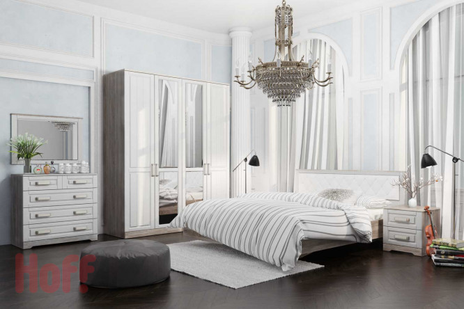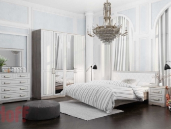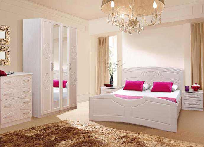 - The number of items required. Standard bedroom furniture includes a bed, wardrobe, dresser, dressing table and bedside tables. However, you should consider the size of the room. In the spacious bedroom you can put the whole complex, decorated in the same style.The owners of such a bedroom can afford a set with a wardrobe, and a six-door wardrobe. For a small room is enough for a bed, a chest of drawers and bedside tables. Overload the room with lots of furniture is not worth it.