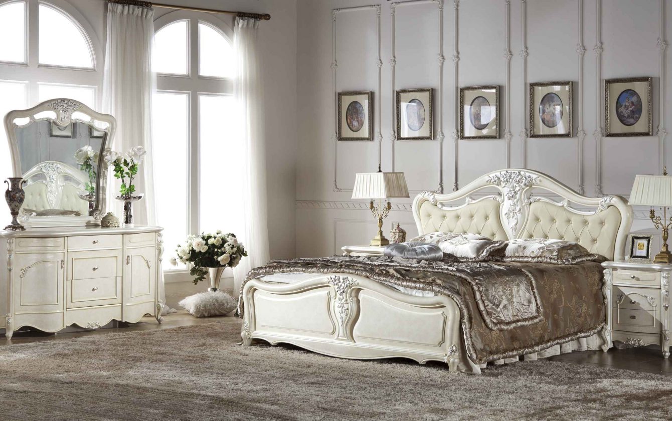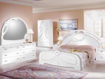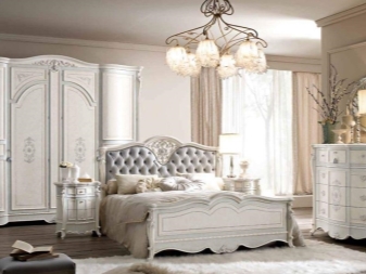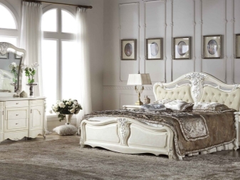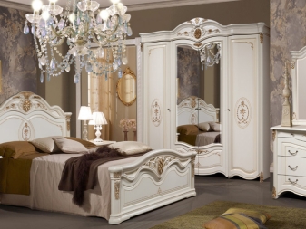 If you want to get a delicate bedroom with carved furniture that resembles air meringue, choose a monochromatic white set. Furniture with a luxurious golden patina will suit those who seriously intend to recreate the decoration of this palace in the room.