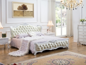 Most often, this furniture is made of wood, but there are also beds with wrought-iron backs. Sometimes headsets are stylized antique. In this case, an imitation of scuffs and chips is specially created. However, in the modern interior this direction is not very popular. More often the French style is embodied only with the help of forms and decor.