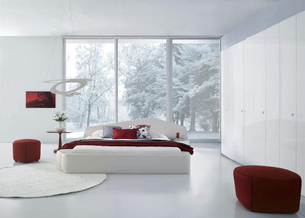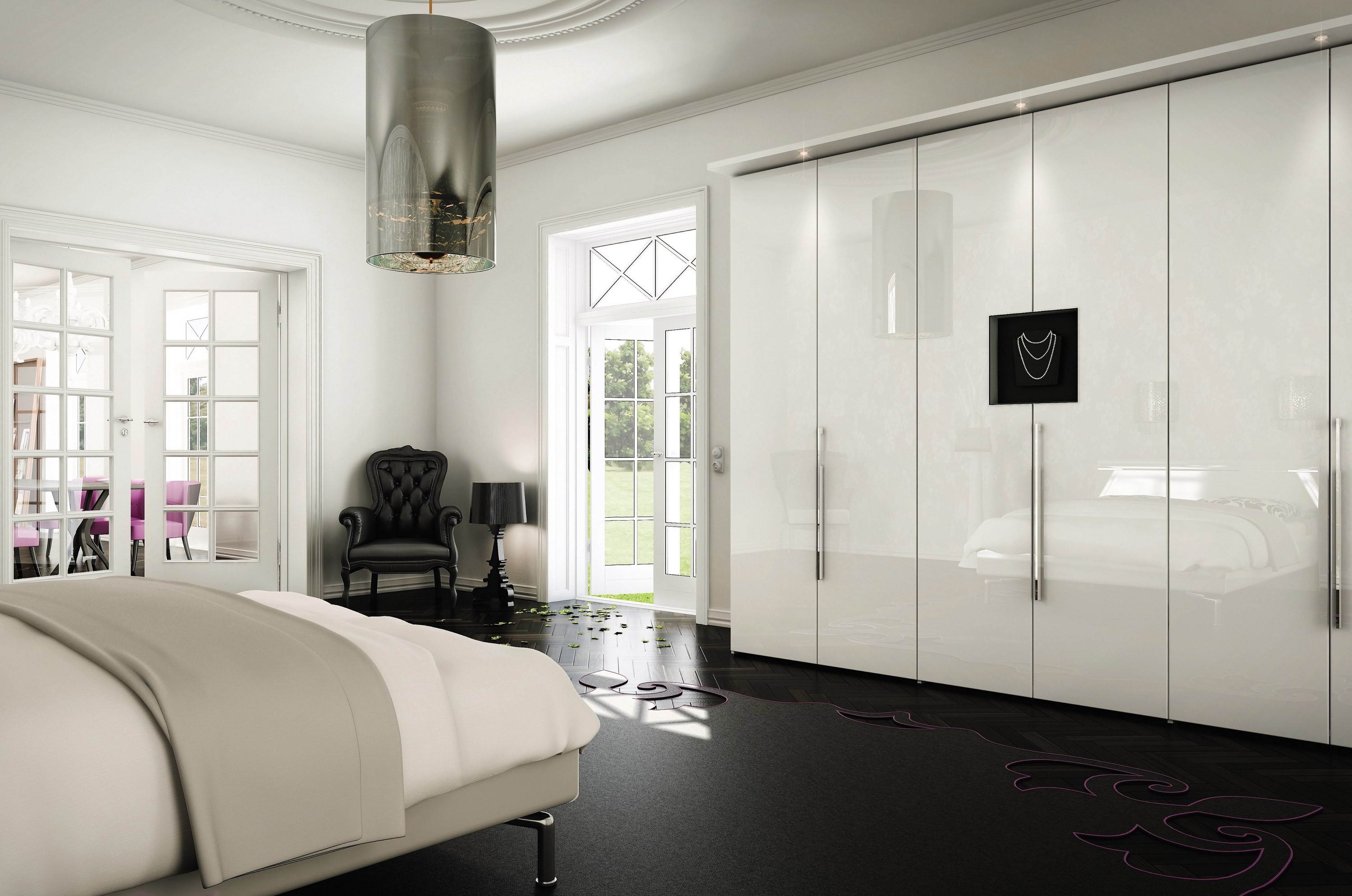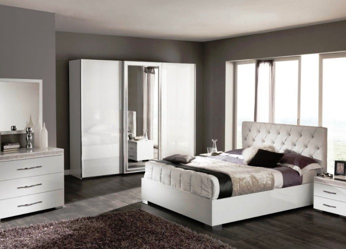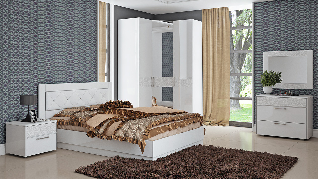 Glossy white bedroom looks luxurious in any design. Today, manufacturers use this type of design not only in modern headsets. Some classic-style furniture is also glossy.