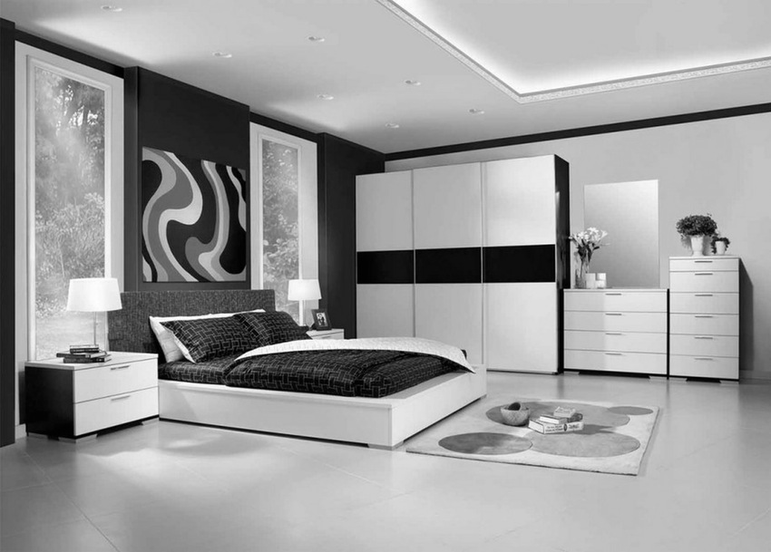 As for the black wall decoration - in the bedroom this version of the interior will look too gloomy and depressing. It is better to use a combination of black and white, or limit it to individual black elements - carpet, curtains, lamps.