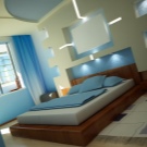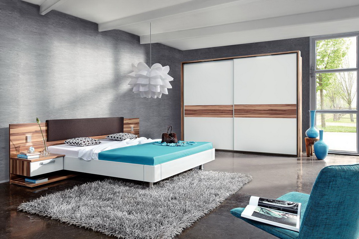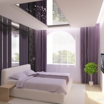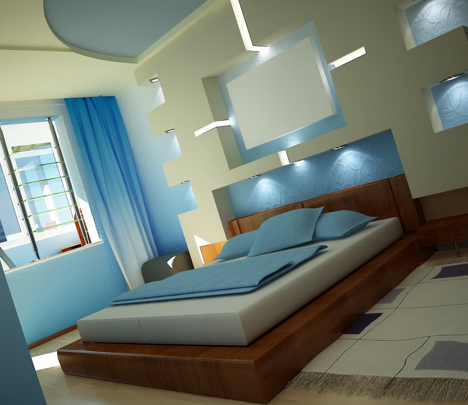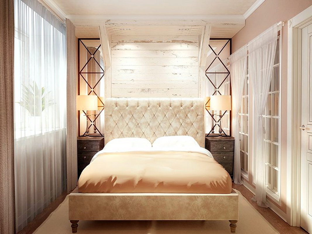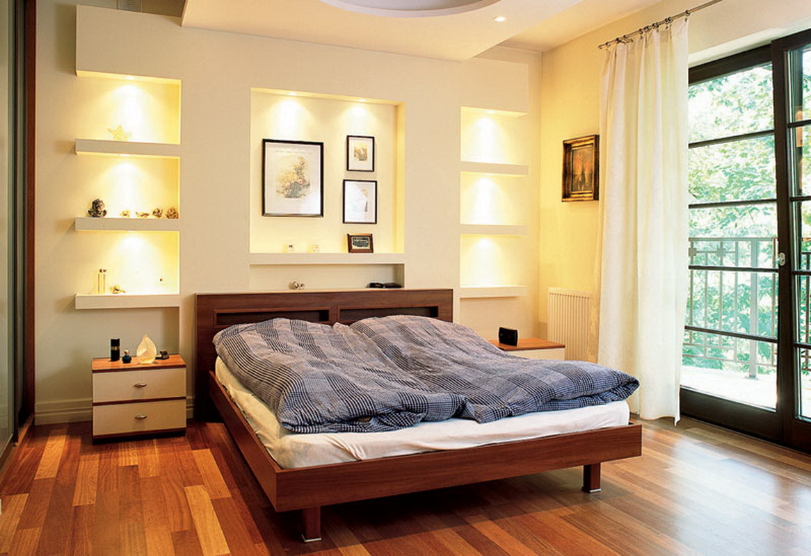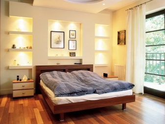 - the presence of shelves and niches above the bed will add functionality and practicality to your room. This option is suitable for fans of reading before going to bed in bed, as well as for fans of watching programs on TV. Make sure that the shelves are located at a convenient height for you. You should not touch their head when sitting on the bed. Calculate the required depth of the niches with shelves, so that things do not fall out on your head;