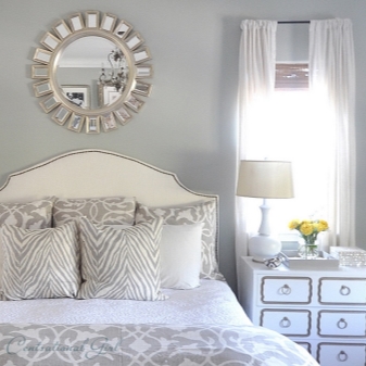 You can also decorate the wall with a mirror. Such an attribute will perform only the function of decoration, because looking at such a reflection is not very convenient. The mirror belongs to the neutral component of the room, because it does not complement the room with paints and color nuances, compared with photo wallpapers and elements of painting. If you choose the frame correctly under the mirror, it can emphasize the style of the room. With the help of mirrors, it is possible to visually correct the area of the bedroom.
