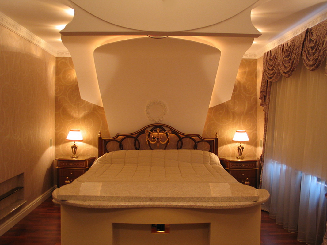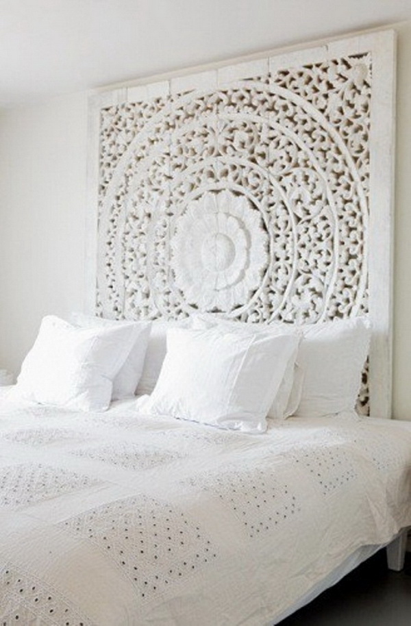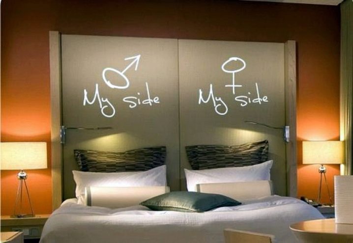 Culture Feng Shui, as well as psychologists recommend placing different designs above the bed. The easiest way to create a box of plasterboard, which is very simple in terms of finishing work and installation. This method is suitable if you have a small area and do not have enough space to store things.Inscription or individual letters fall into the category of new and inexpensive ways to decorate the headboards. With this decor you will manifest yourself in the design, as well as be able to demonstrate and maintain all the most intimate. The canopy or curtain is preferred by romantic personalities. Such a decision is a manifestation of comfort and coziness. The decoration is worthy of a place in the interiors of spacious bedrooms and will give you delicate dreams, softening the geometric angles of furniture.