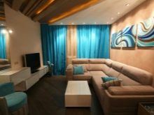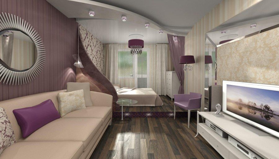 Zoning with flowers will help turn one room into several - a separate bedroom and a complete space for guests.The color of the room can be primary, for example, beige, and this or that space is designated by wallpaper with a pattern or ornament.