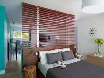 Interesting idea zoning headboard or headboard. Its essence is the high original back (front and back), which will delimit the room and create an accent in it.