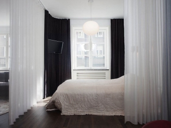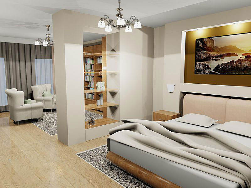 It is important to maintain a single style in the room and visually divide it into sections. It is not necessary to hide the bed behind a rack or a closed door, let it be visible. The coloring or texture of the walls can talk about the function of the site, as well as the floor and the furniture itself.