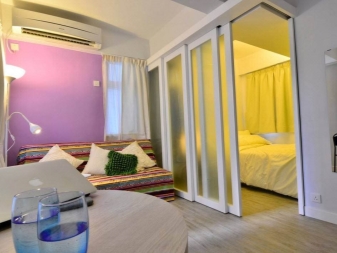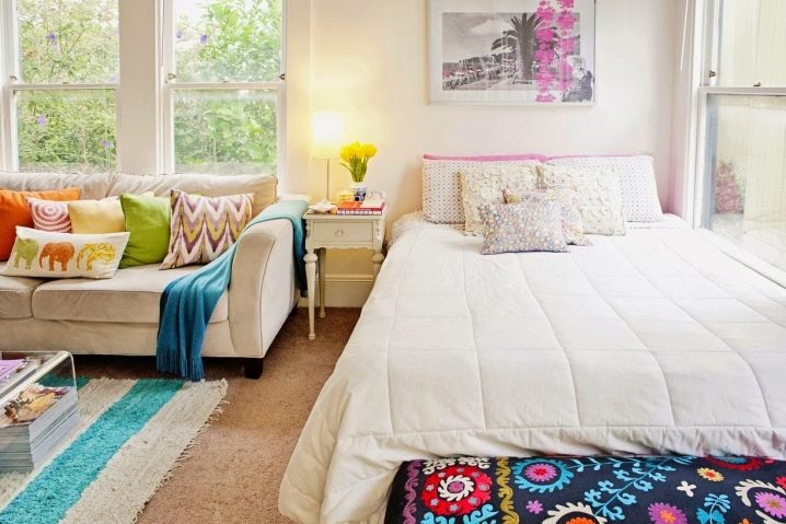 The simplest and most inexpensive idea is to do without partitions in one room and create a cozy and homely atmosphere with an emphasis on bright textiles - let the bedroom be pink, and the living room blue.