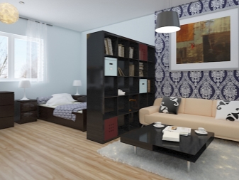 A design project of an apartment with a shelving or partition in the middle is the simplest affordable solution. It is important to choose furniture in the same style and dilute it with textiles more brightly - for the living room, a little quieter - for the bedroom. If the space is divided by a wall, then it must be in harmony with the general color of the walls, the rack can “resist” them and be contrast.