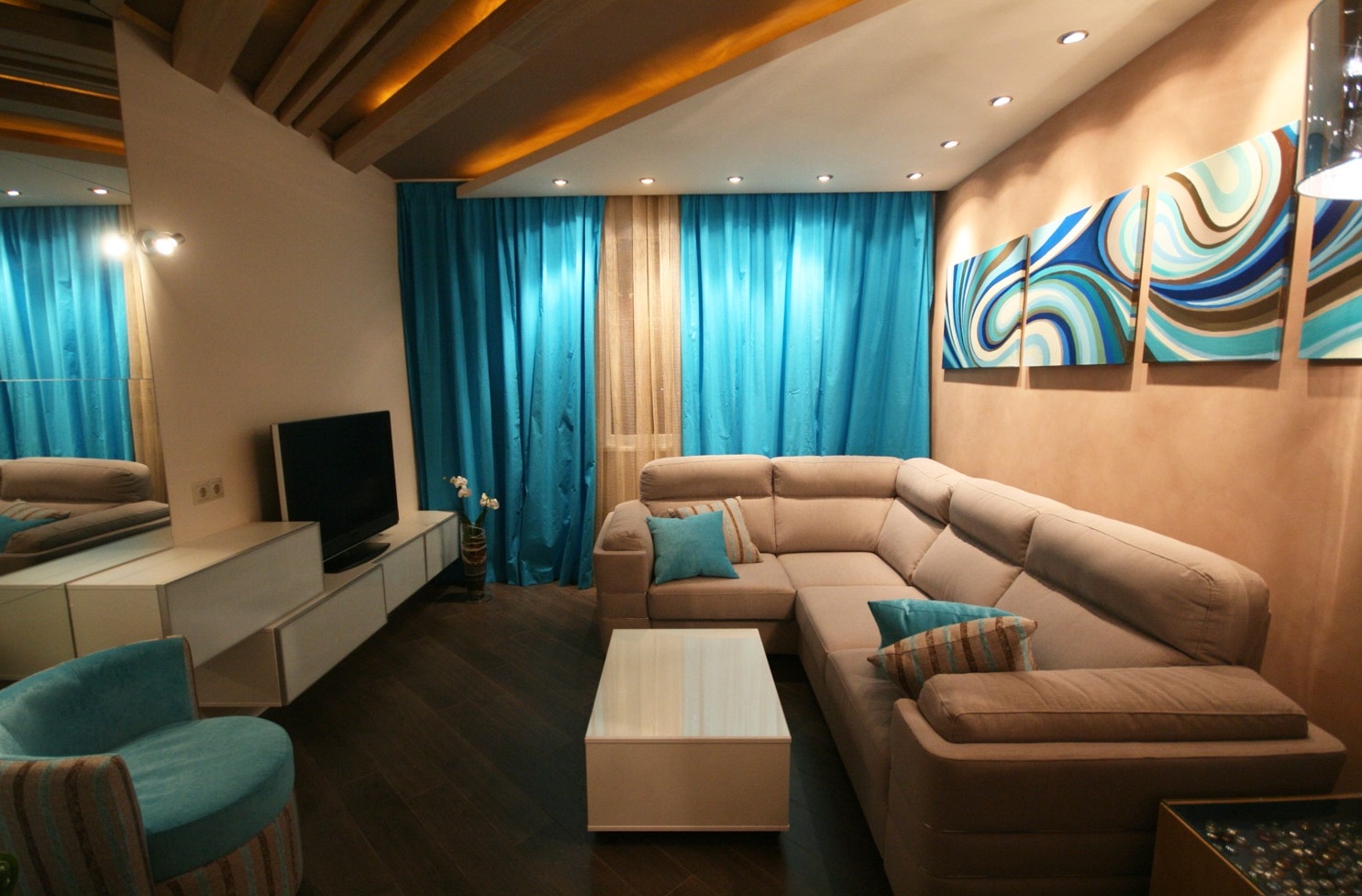 - Instead of bulky chandeliers choose spot lighting, located around the perimeter of the room on the ceiling;
