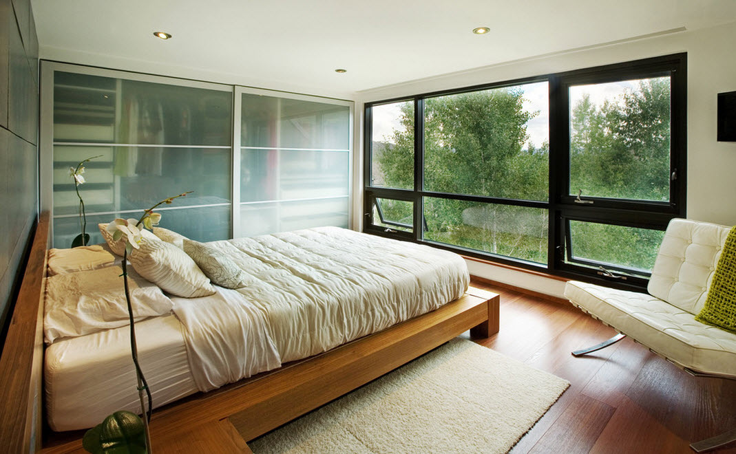 A large window visually makes the space of the room larger and illuminates it favorably. If the window occupies an entire wall, this is an excellent reason to create an informal interior in the style of a loft, minimalism. Be sure to position the bed to him "face" and divide the space with its back.