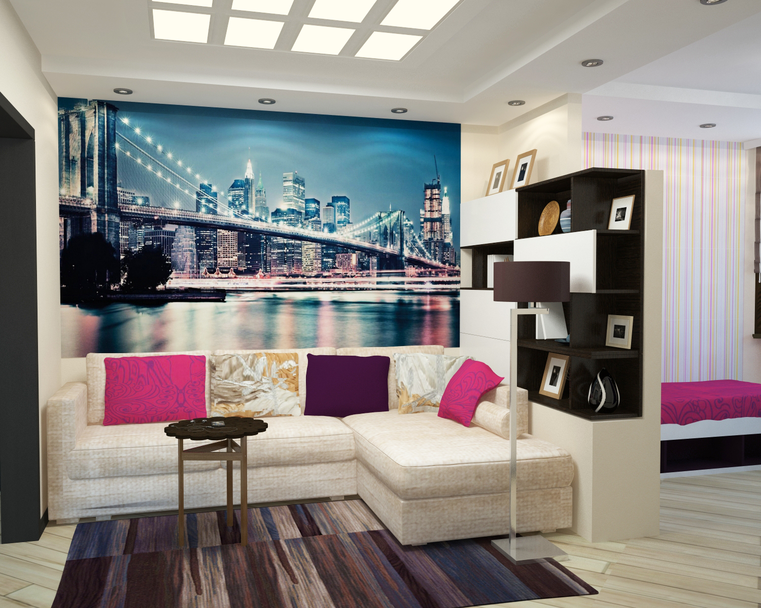 The solution is more expensive - zoning of the room by the ceiling, floor and partition. Notice that the overall mood and style of the room is preserved by the accent violet wall and the contrasting curtains. One and the floor - bright laminate without podiums and thresholds.