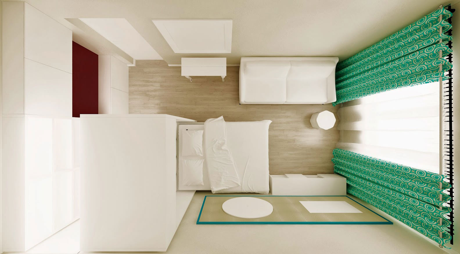 If you prefer minimalism and choose a bed, sofa and TV (and no tables, chairs), then it is important to think about where the rest of things will be stored - on the balcony or in the closet in the niche of the corridor.