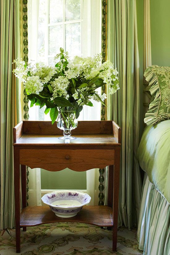 If the bedroom is decorated in the style of Provence, then the aged snow-white furniture that looks attractive and stylish will be an excellent option. The tandem of green and white colors looks quite beautiful, it will surely please the owners of the premises. Many designers advise buying furniture made of birch or pine for such premises. In the green room look great and bamboo products.