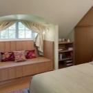 The same applies to the protrusions and niches, which are abundant in asymmetrical rooms. They are perfect for accommodating small modules that can become storage systems. And considering that a complete wardrobe in a small room, especially with a sloping ceiling, is not so easy to install, then give preference to dressers and low shelves. They will serve as an excellent replacement for you and will be used 100%.