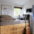 Beds with drawers for storing linen, dressers and deep baskets, hanging shelves and a small but roomy wardrobe - all this will free the surface from decorative details, creating a “creative mess” and imaginary comfort in the room. And they artificially expand the space, making the bedroom more free and brighter.