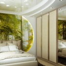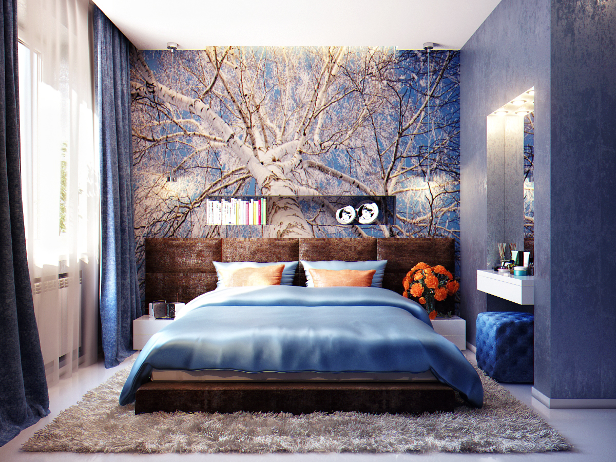 Wall murals will also help to visually enlarge the bedroom, because having chosen calm urban and wild landscapes, large flowers or just a smoke hanging over the field, you will expand the space of the room without making any special effort for this.