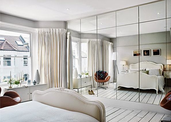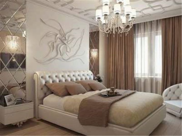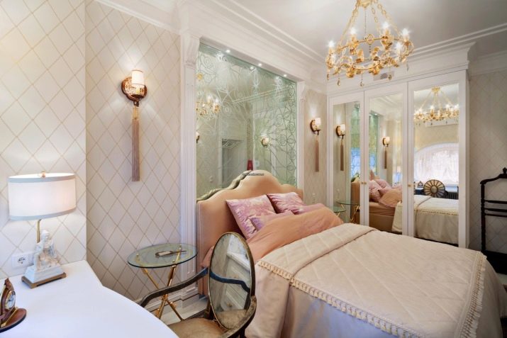 By the way, mirrors not only artificially make the bedroom bigger, and the ceilings are higher, but also perfectly hide secret cabinets behind the walls, shelves and other everyday items, usually spoiling the general appearance of the room.