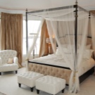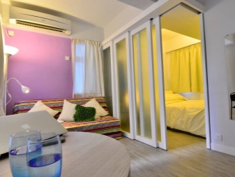The simplest option of zoning space is a canopy or a curtain. They will also cope well with the task and hide the bed from the guests.