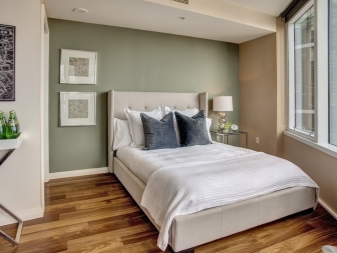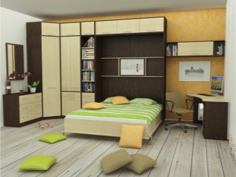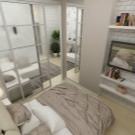 In the bedroom, it is important to place a wardrobe, rack, shelves, chest of drawers or bedside tables to compactly fold their belongings in them. For convenience, you can buy a coffee table on wheels, which, if desired, can be rearranged.