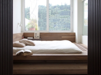 Visually divide the space will help install the podium.A bed is installed on it, and in its niche it is possible to make retractable storage tanks. Along the perimeter of the podium, you can attach the LED strip, which will add mystery to the interior in the dark.