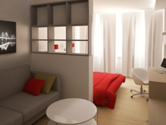 Another interesting option - rack. Split a room of 16 meters and light racks with through shelves can add uniqueness to it. Thus, items on the shelves will block one area from another.