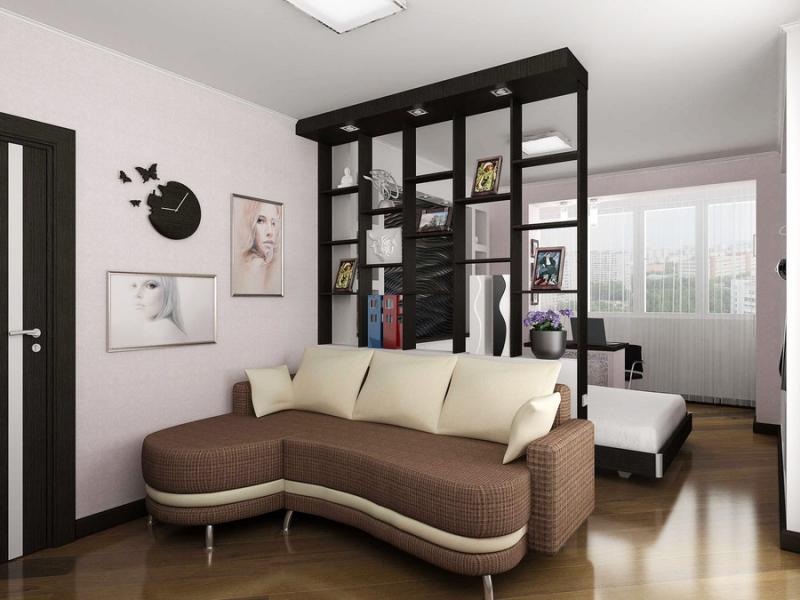 The partition can serve as a wall of plasterboard or glass. This will improve the interior and solve the problem of personal space. An interesting way can be a bed, enclosed by a plasterboard wall of unusual shape. A sofa can be set back to the partition, so that it seemed that this was the end of the room.