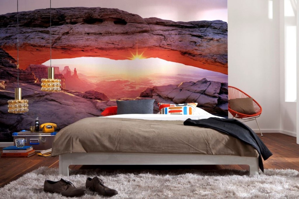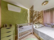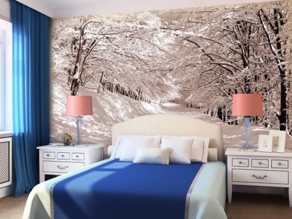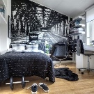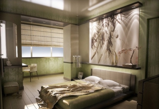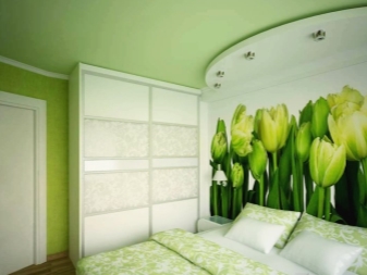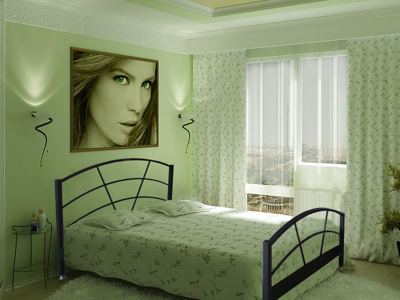 Decorating the wall with wall murals is a simple and affordable way to visually make the bedroom larger. In this interior there are no frills, and the pleasant green color has a calming effect on sleeping.