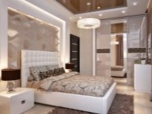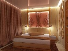 When thinking about the design for a bedroom without a window, pay attention to the following images.Analogue of natural lighting here are the LEDs installed in a niche above the bed.