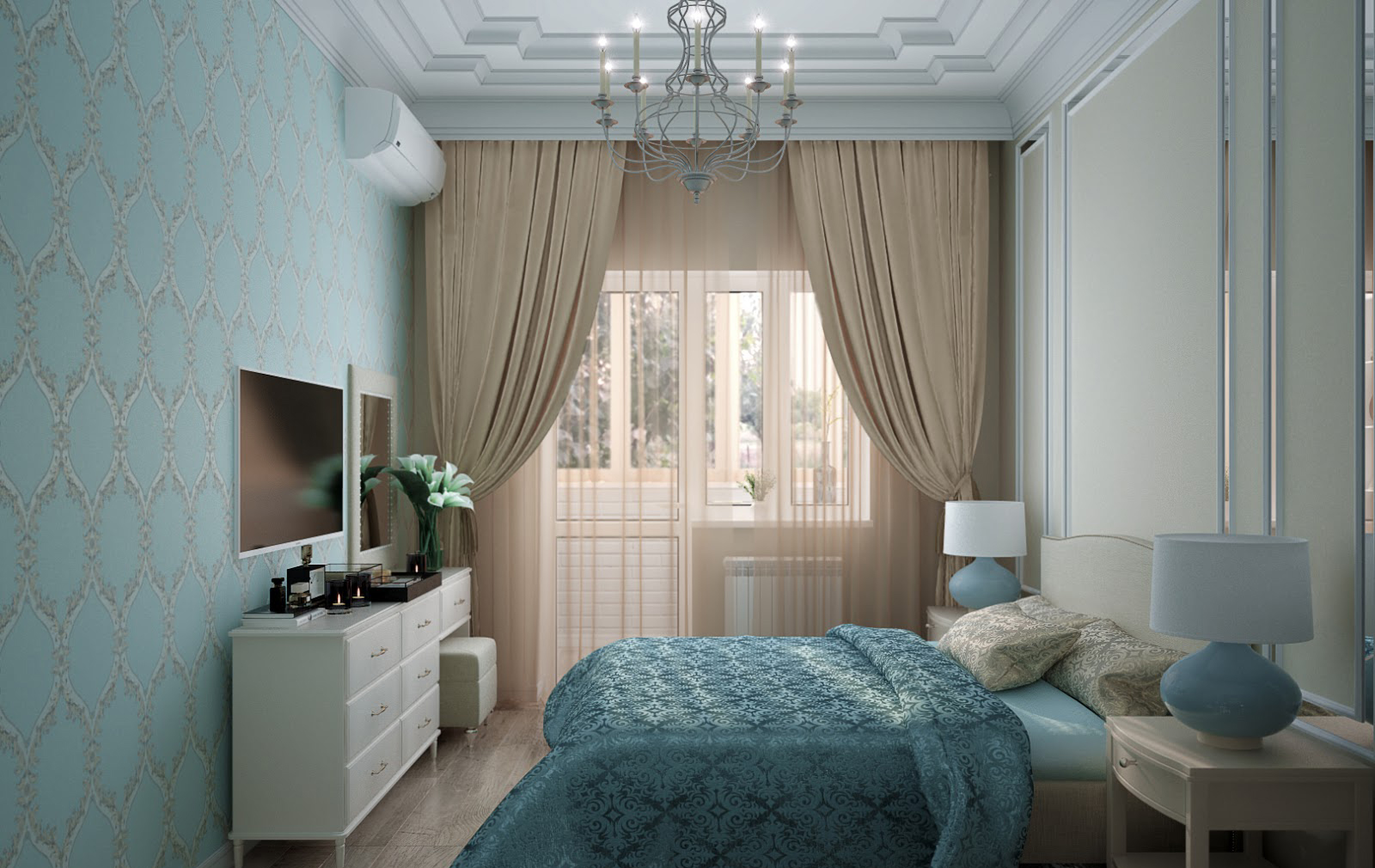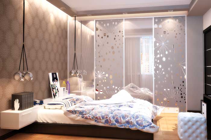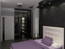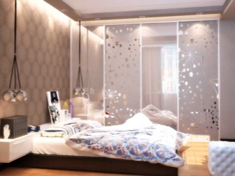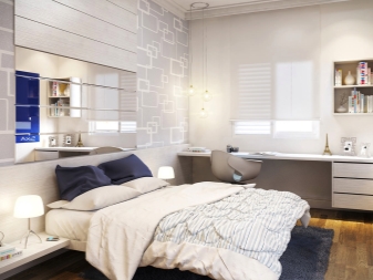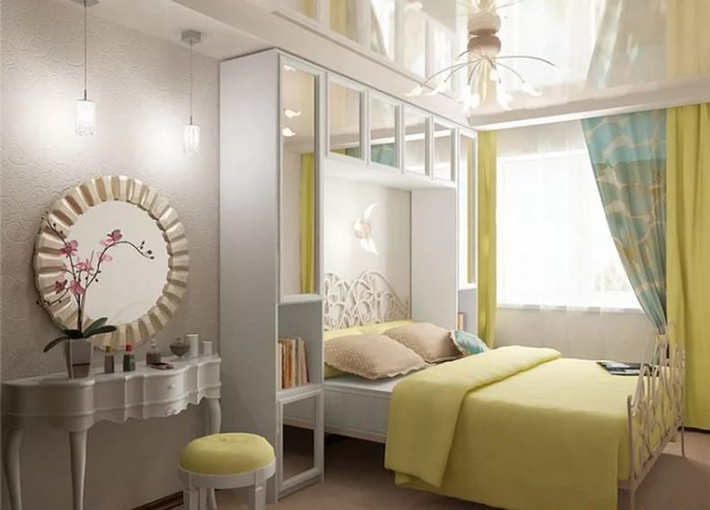 Here is another interesting option. In this case, the space is expanded through the skillful use of mirrors, as well as the successful selection of furniture. A light-colored wrought-iron bed looks airy, and installing a closet at the head of the bed is a great idea to save space.