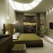Choosing the best sources of lighting is another important point when planning a bedroom design. Difficulties may arise in the selection of overhead lighting.The ceilings in the “Khrushchev” are pretty low, so the standard hanging chandelier will not work. A good choice would be a bush lamp, which is a flat analogue of a chandelier.